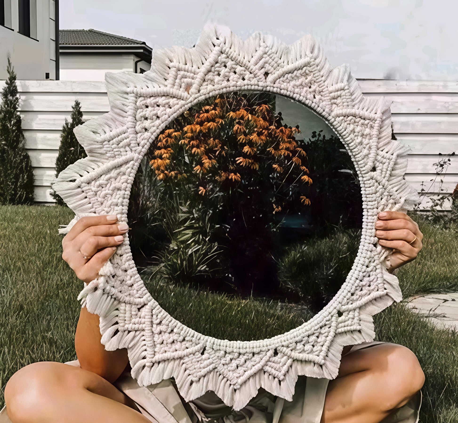 RAINBOW LIFESTYLE MACRAME MIRROR he macrame wall décor mirror is ideal for the wall because it blends usefulness and beauty. The macrame weaving wall hanging mirror is both functional and attractive. It's a lovely present for your colleagues who are impressed by boho style.